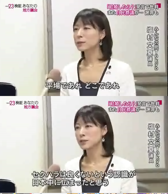 6月の「早く結婚しろよ」発言に続き、またも別の男性都議から「結婚したらどうだ」とのセクハラ発言が飛び出した東京都議会。塩村文夏都議は17日に開かれた市民集会で「(将来妊娠した場合)本当に産んでもいいのかという不安は、いま強く感じている」と話した。
