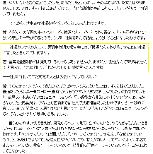 2012.4.3「(23年3月15日未明に)私は清水正孝社長を呼んだ。清水社長は私が(全面撤退はダメだと)言ったときに『そんなことは言っていませんよ』なんて反論は一切なかった。やはり(全面撤退を)思っていたんだなと思う」(政府事故調)