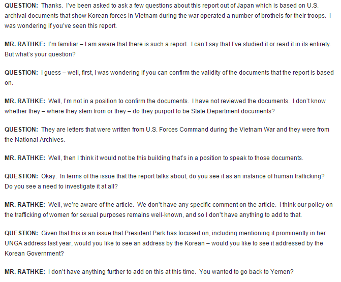 3月26日の国務省記者会見で「米国立公文書館の文書がベトナム駐留の韓国軍が売春宿を運営していたことを証したという日本からの報道を知っているか」と いう質問が出た。ラトケ報道官は「知っている」と答えた。「この事例は人身売買だが、調査する意図はないか」「この問題で韓国政府と協議するか」などとい う関連質問も出た。報道官は確かな答えは与えなかったが、「韓国軍の慰安婦問題」が米側の国政の場で知られる結果となったのは確かだ。